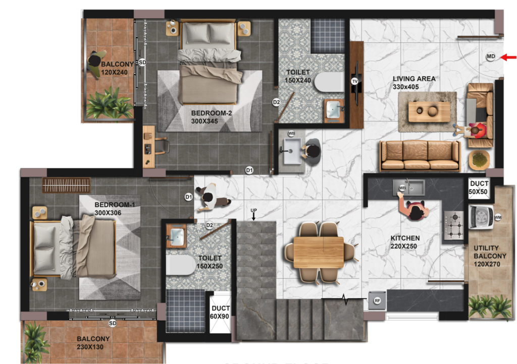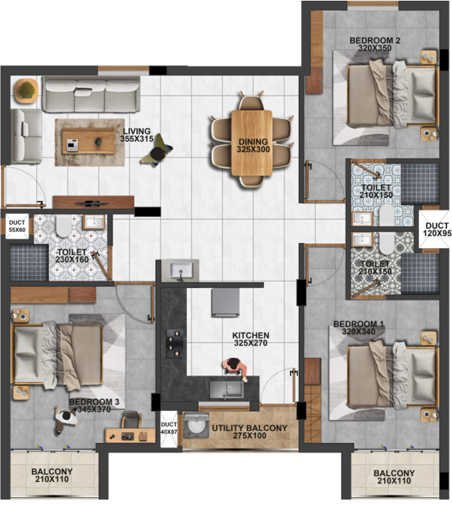 FLOORING Premium vitrified tiles for the living room, dining area, bedrooms, and kitchen. High-quality ceramic tiles for toilets and balconies to ensure durability and safety.